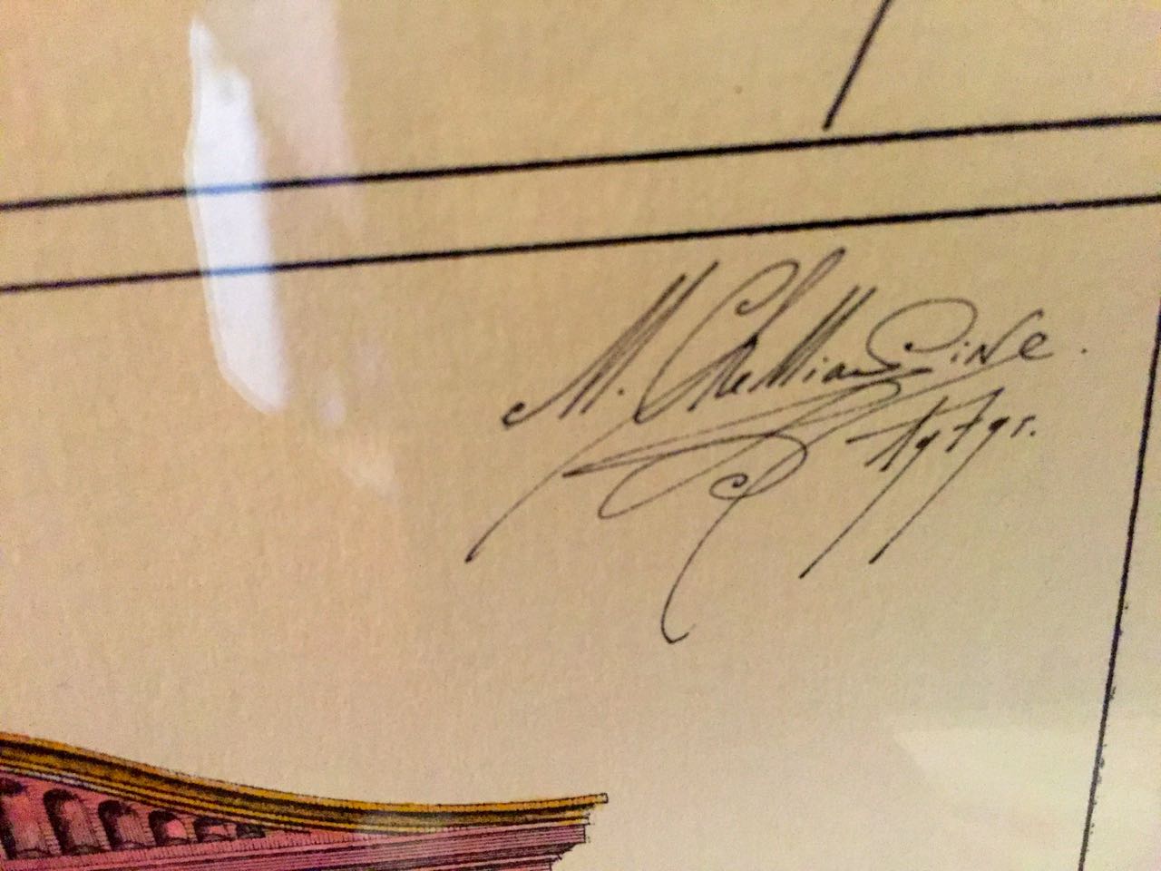 The drawing is beautifully presented in a custom archival framing setup. A bold black marbleized frame with gold accents complements the graphic strength of the work, while a wide, rich velvet-textured matting in deep mauve provides a sumptuous depth. Two additional inner mats in cream and a burgundy-lavender shade subtly highlight the fine linear detail and the softer color tones of the drawing itself. A narrow gilt liner closest to the artwork lends a final touch of elegance, giving the presentation a museum-quality finish.