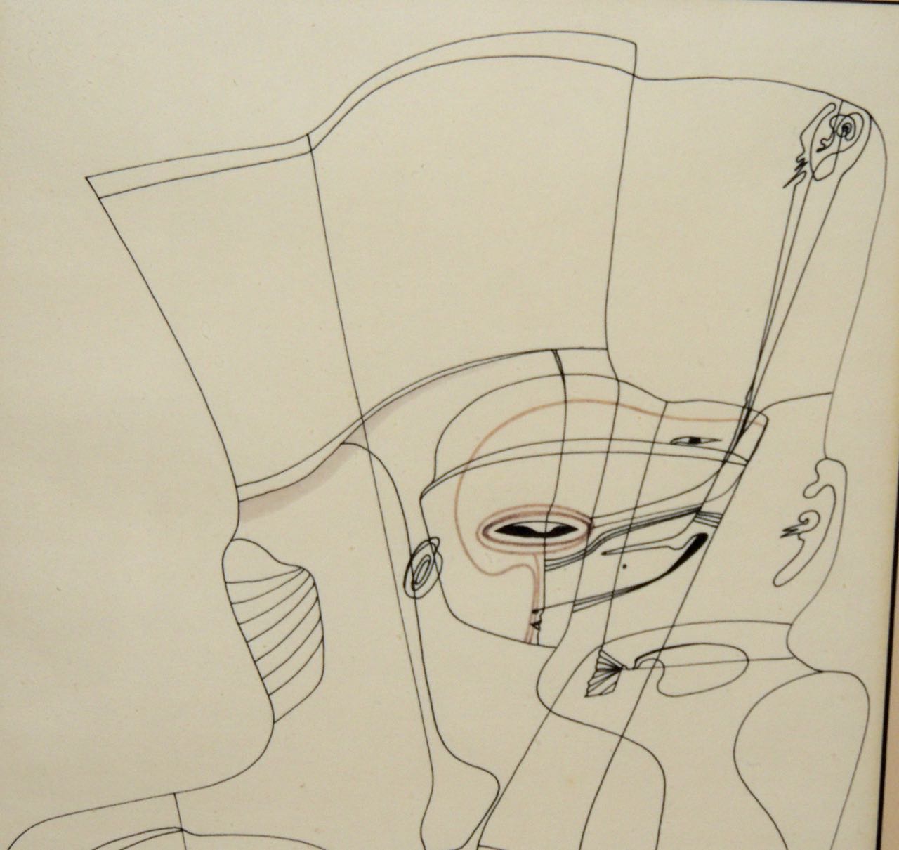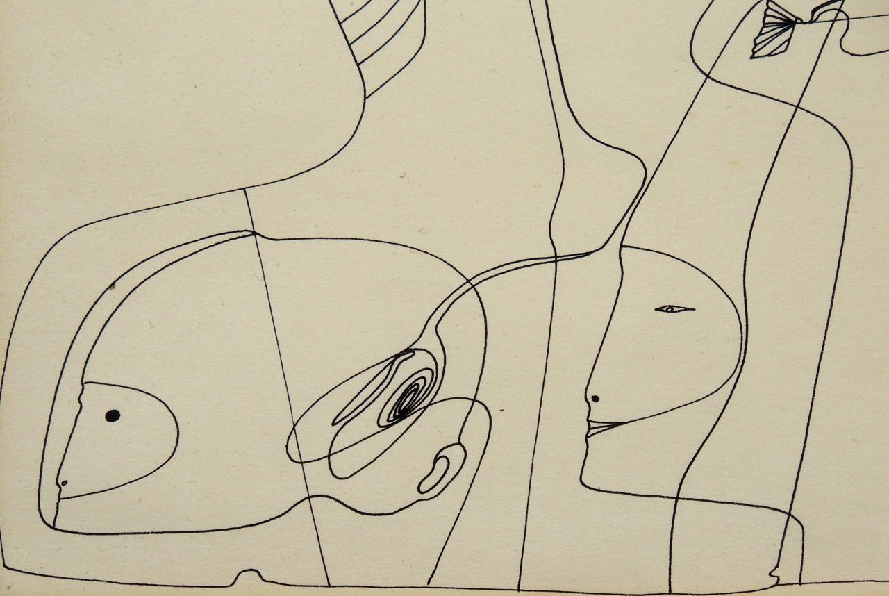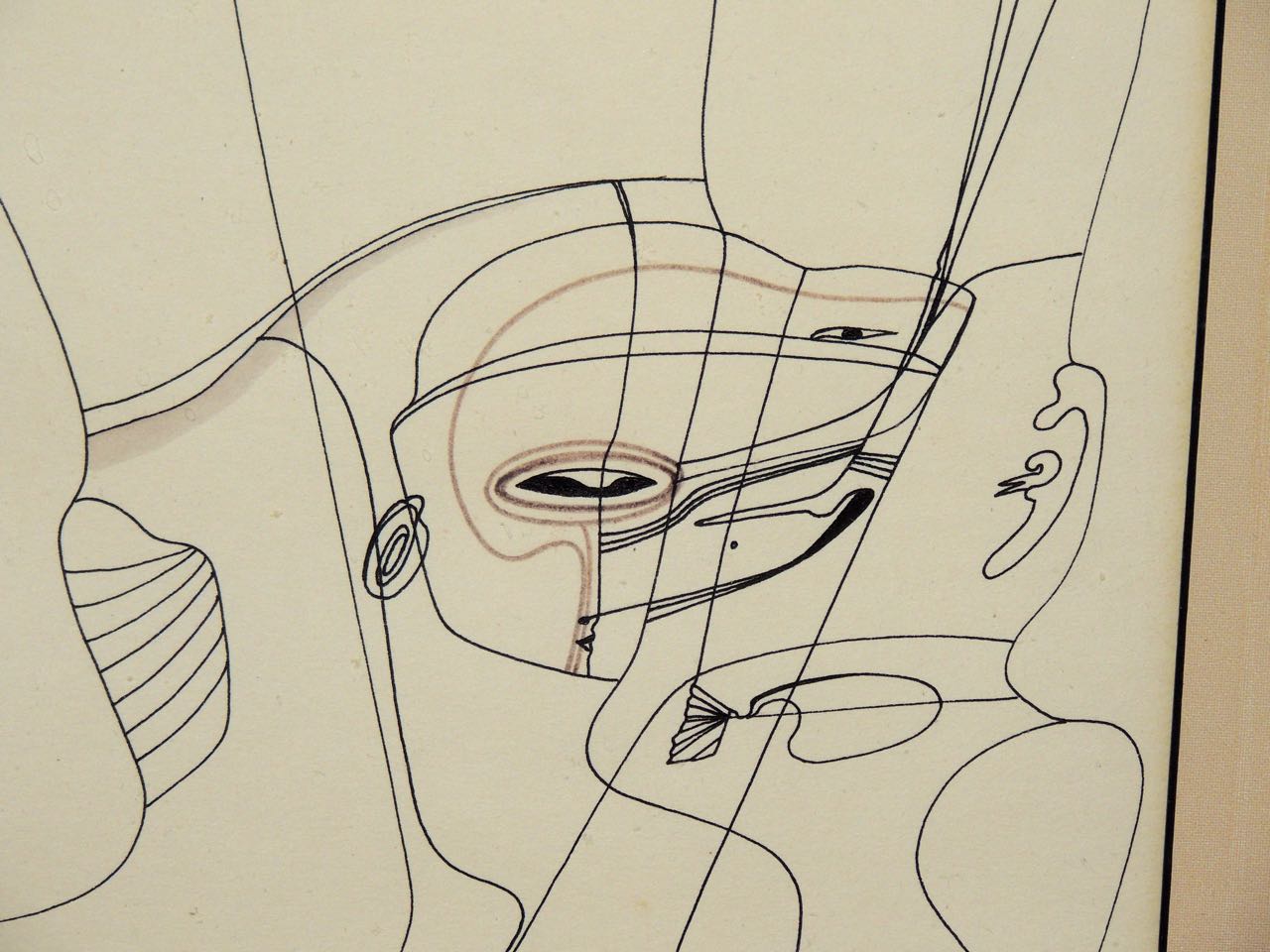 Chemiakin's technical mastery is on full display here: despite the apparent spontaneity of the line, the drawing is carefully composed, balancing large planes of empty space against densely detailed facial abstractions.