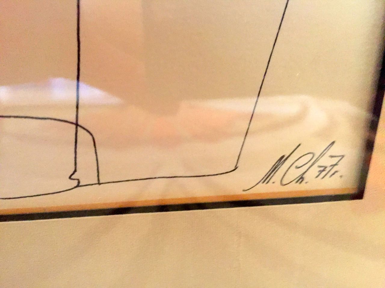 Ink on Paper, Signed and Dated 1971This extraordinary original ink drawing by Mihail Chemiakin, created in 1971, presents a surrealist interpretation of a "Russian Helmet," executed with his characteristic fluid, continuous line technique. The composition feels simultaneously weightless and monumental, with interwoven, biomorphic forms suggesting faces, armor, and abstracted anatomical features. The helmet form at the top of the drawing dominates the structure, morphing organically into surreal figural elements below, as if merging man and machine, spirit and armor.