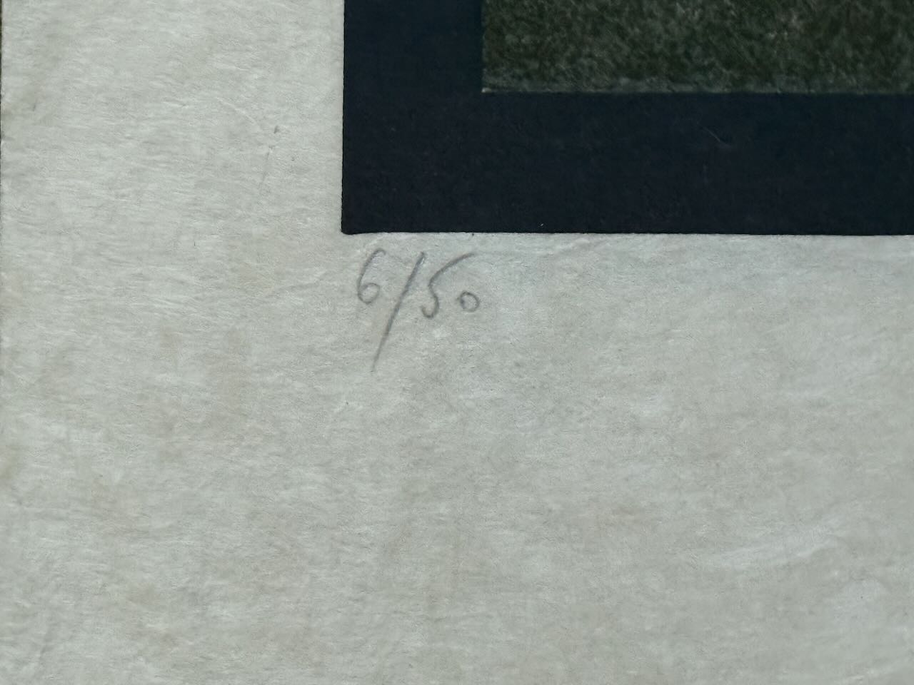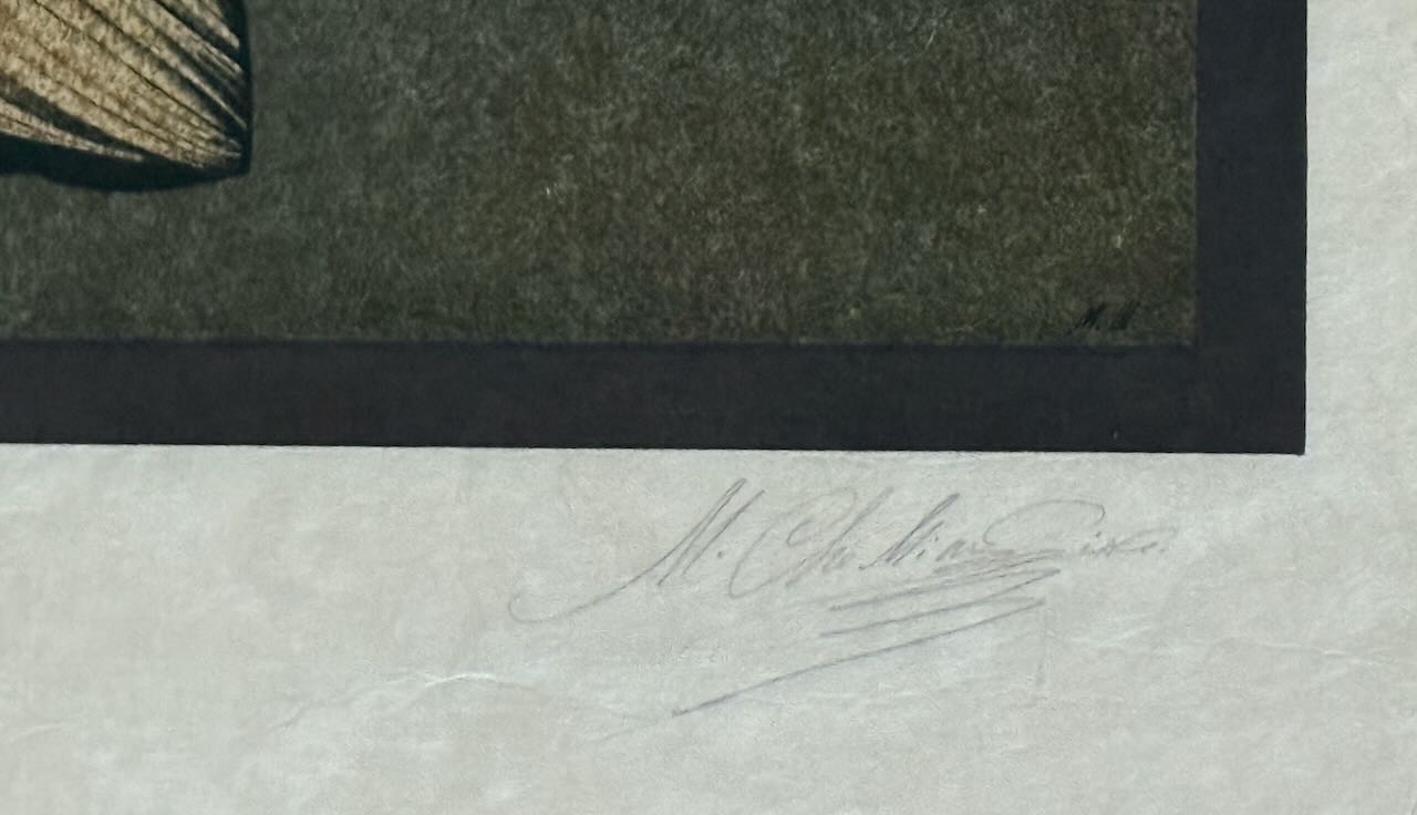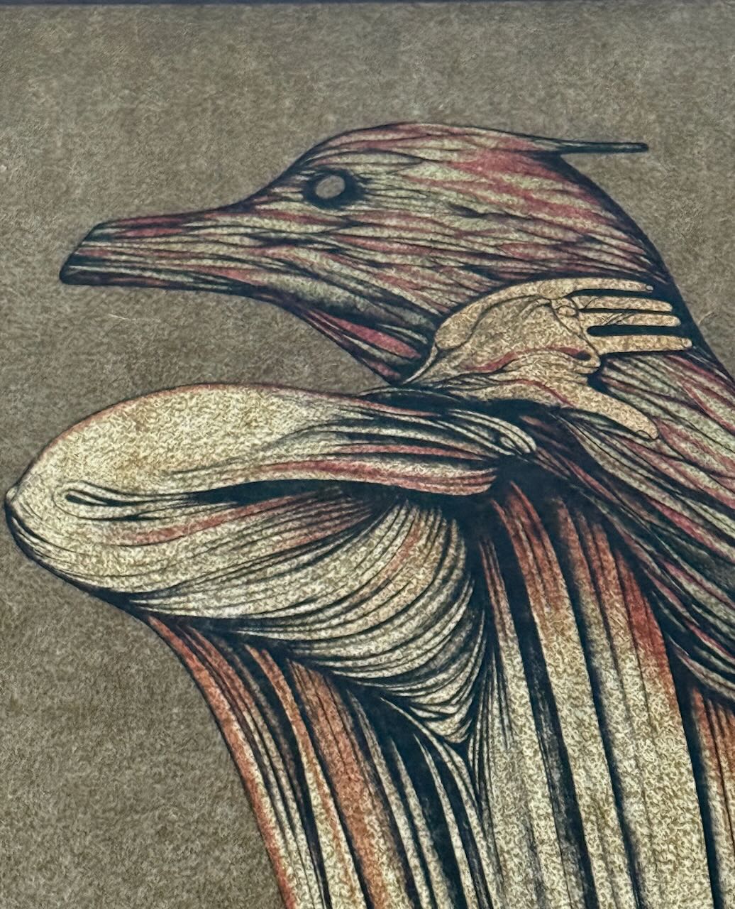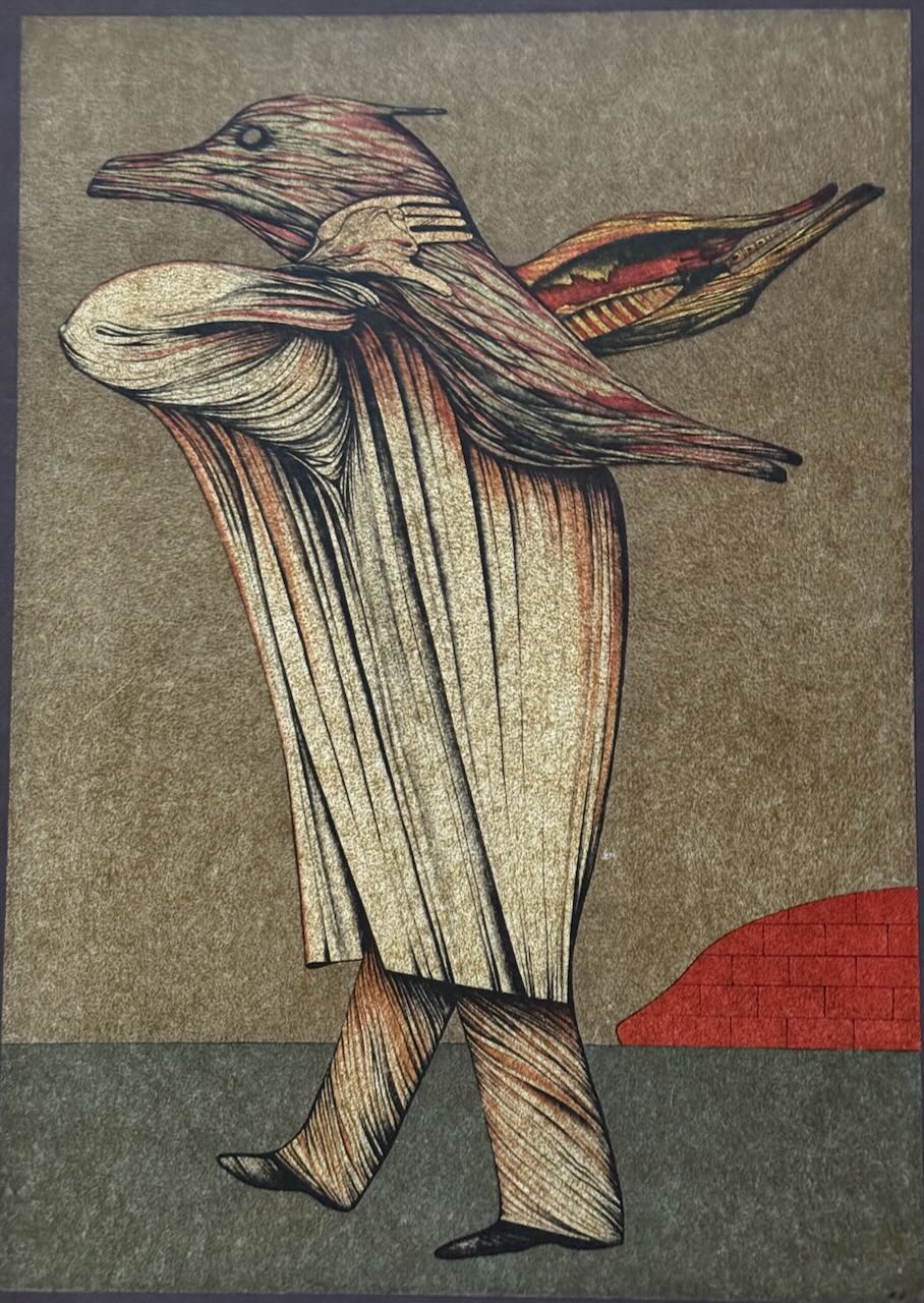 This bold and surreal lithograph by Mihail Chemiakin, part of the Ventre de Paris (The Belly of Paris) series from 1977, transforms a butcher hauling a side of beef into a fantastical hybrid figure—part man, part bird, part carcass. The visual fusion of flesh and form, rendered in Chemiakin’s signature metamorphic style, creates a haunting figure with a distorted anatomy that evokes both the weight of labor and the grotesque poetry of the marketplace.